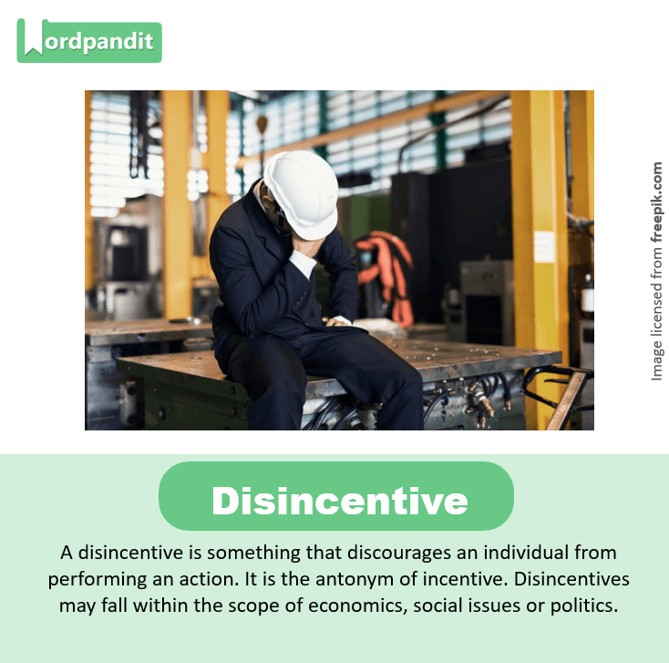 • A disincentive is something that discourages an individual from performing an action. It is the antonym of incentive. Disincentives may fall within the scope of economics, social issues or politics.