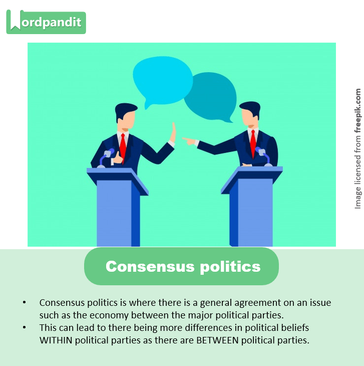 • Consensus politics is where there is a general agreement on an issue such as the economy between the major political parties. This can lead to there being more differences in political beliefs WITHIN political parties as there are BETWEEN political parties.