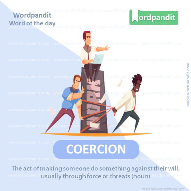 MEANING: The act of making someone do something against their will, usually through force or threats (noun).
