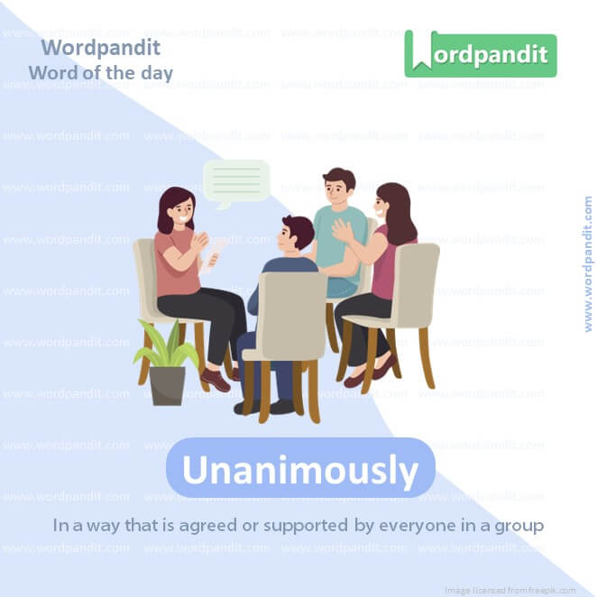 Meaning: In a way that is agreed or supported by everyone in a group.