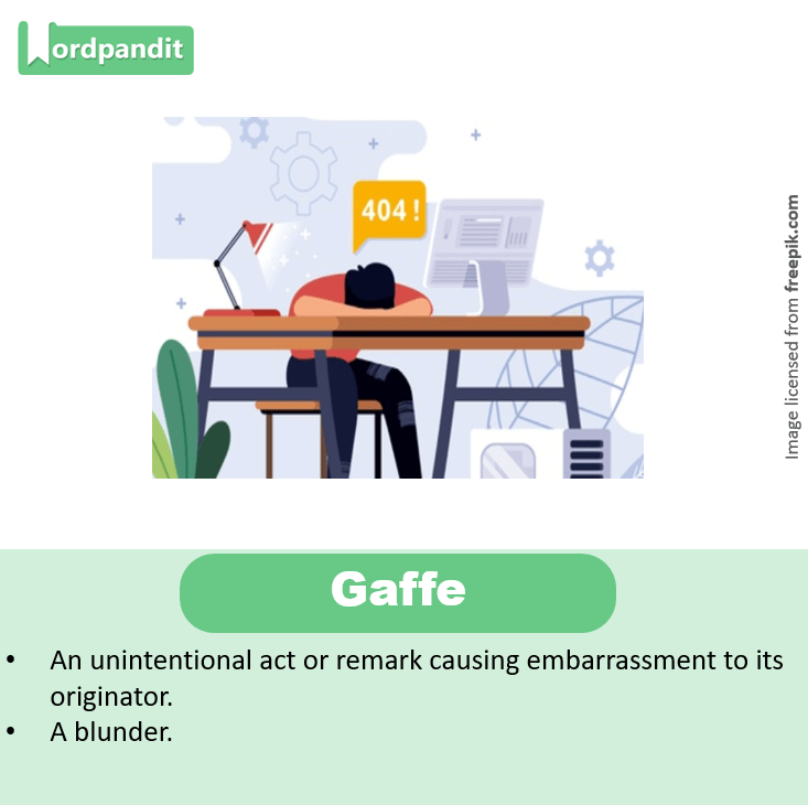 • Gaffe is of French origin, originally a ‘boat hook’ as in ‘gaff rig’ where the relation is apparent, but the sense association to a blundering remark is obscure.