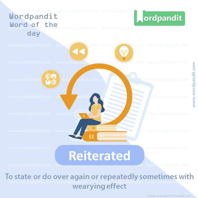Meaning: To state or do over again or repeatedly sometimes with wearying effect.