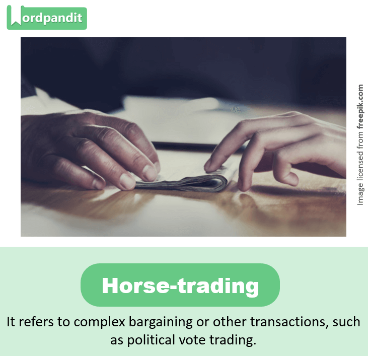 • Usage:The prime minister is in the midst of political horse trading with possible partners as he seeks to build a majority coalition in the coming election.