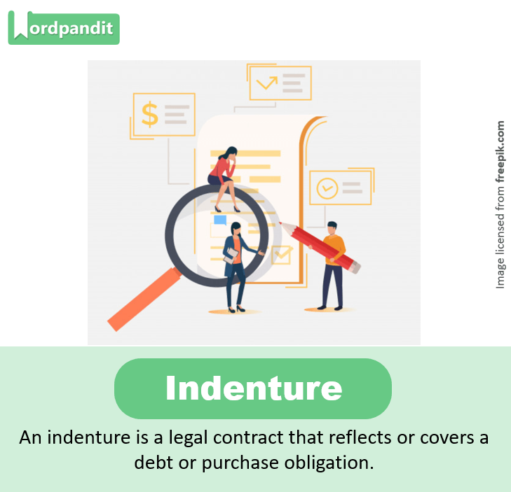 • An indenture is a legal contract that reflects or covers a debt or purchase obligation.