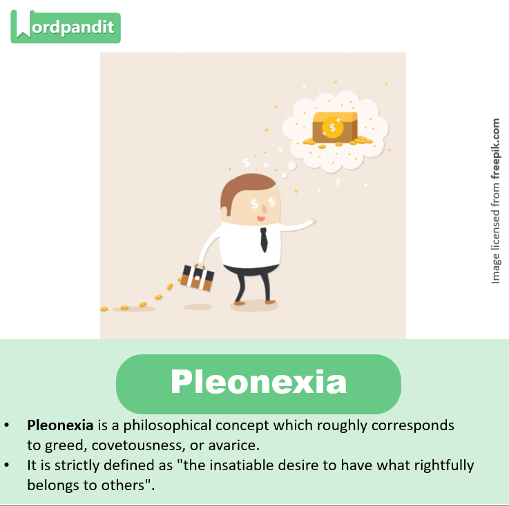 • Pleonexia is a philosophical concept which roughly corresponds to greed, covetousness, or avarice.