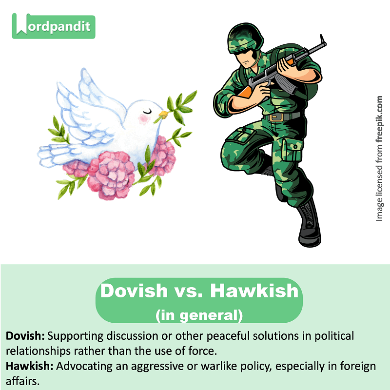 Dovish: Supporting discussion or other peaceful solutions in political relationships rather than the use of force.
