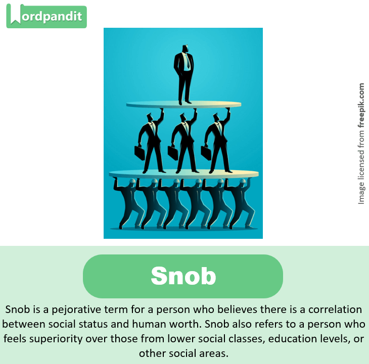 Snob is a pejorative term for a person who believes there is a correlation between social status and human worth. Snob also refers to a person who feels superiority over those from lower social classes, education levels, or other social areas.