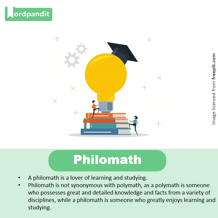 • Philomath is not synonymous with polymath, as a polymath is someone who possesses great and detailed knowledge and facts from a variety of disciplines, while a philomath is someone who greatly enjoys learning and studying.