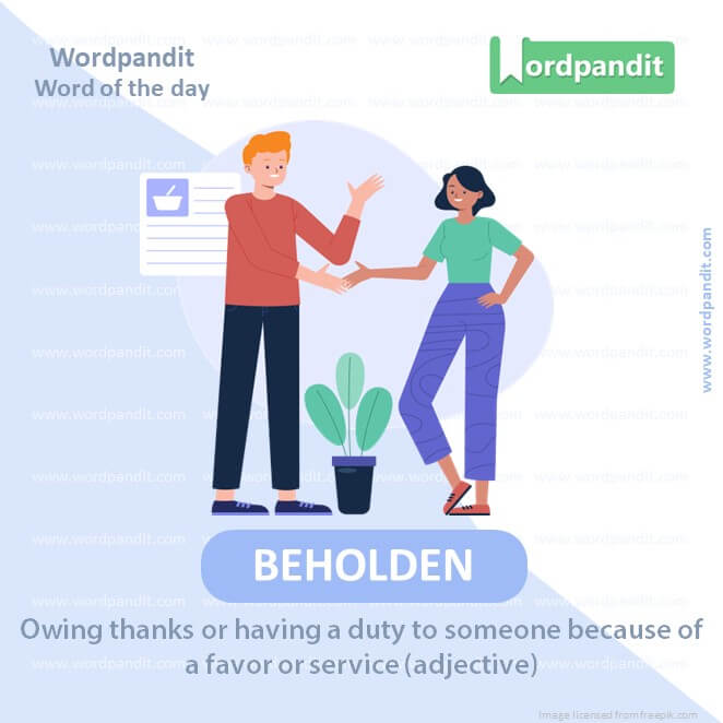EXPLANATORY PARAGRAPH: Imagine if someone gave you a special gift and now you feel like you should do something nice for them in return. That feeling of wanting to give back because they did something for you is called “beholden”.