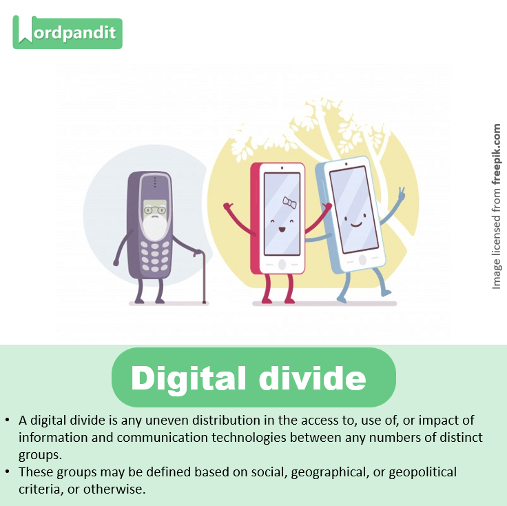 • A digital divide is any uneven distribution in the access to, use of, or impact of information and communication technologies between any numbers of distinct groups.