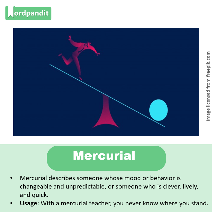 • Mercurial describes someone whose mood or behavior is changeable and unpredictable, or someone who is clever, lively, and quick.