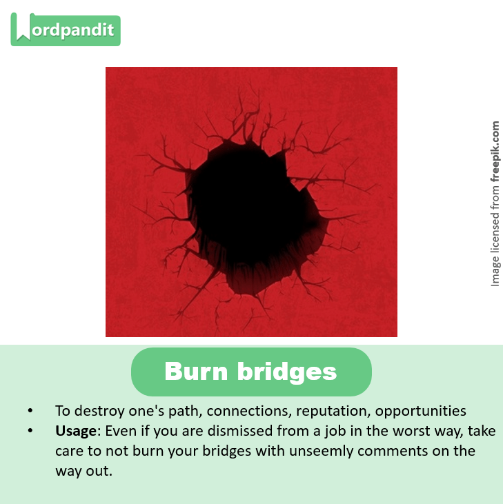 Usage: Even if you are dismissed from a job in the worst way, take care to not burn your bridges with unseemly comments on the way out.
