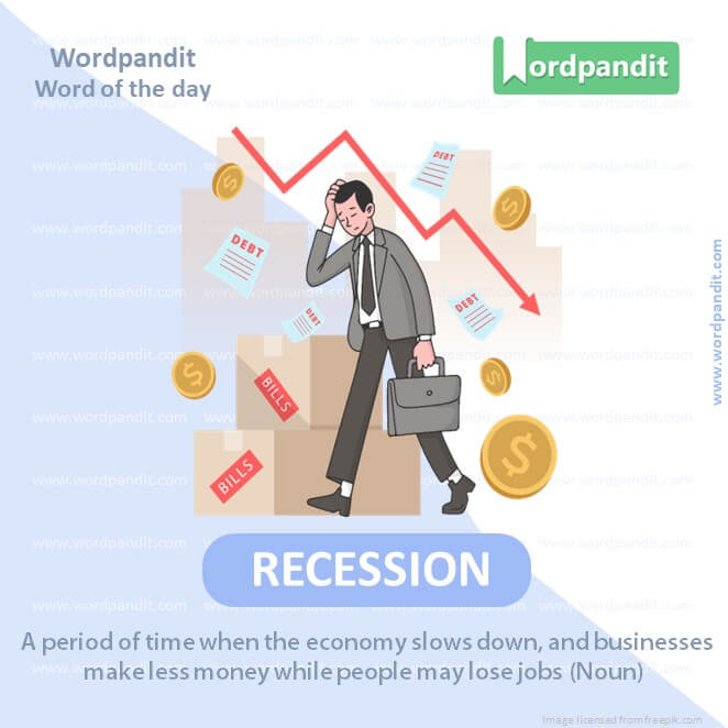 MEANING: A period of time when the economy slows down, and businesses make less money while people may lose jobs. (Noun)