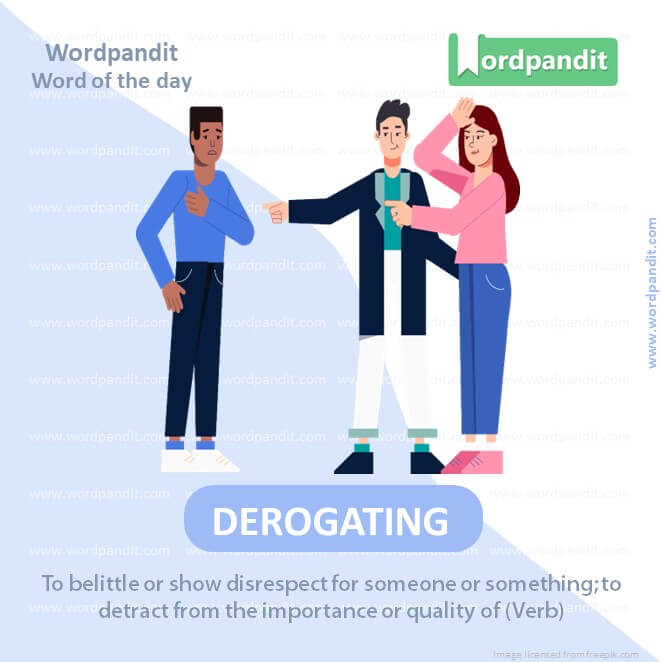 EXPLANATORY PARAGRAPH: Derogating means saying bad things about someone or something to make them seem less important. It’s like if someone made a really nice painting and you said, “Well, anyone could do that.” That’s not very nice, is it?
