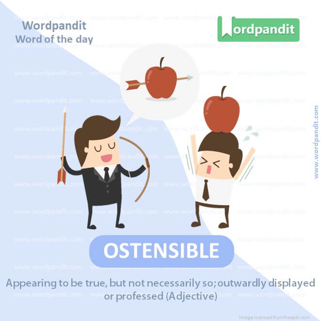 EXPLANATORY PARAGRAPH: Ostensible means something looks one way but might be different in reality. Imagine you have a box that looks like it’s full of cookies, but when you open it, you find vegetables inside. The box had an ostensible purpose of holding cookies, but it actually had veggies!