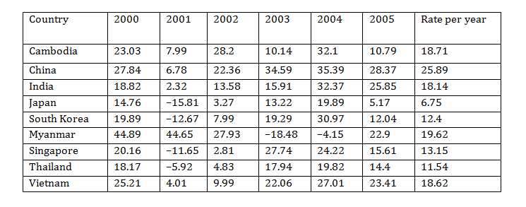 Option C: During 2001-2002, Cambodia registered the highest annual export growth rate, i.e., 28.2%. Hence, (C) is not true.