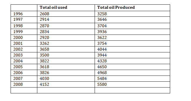A total of 4 years are there for which the growth rate in ‘Production of Oil’ is more than the growth rate in ‘Total oil used’ viz., 1997, 2004, 2006 and 2007.