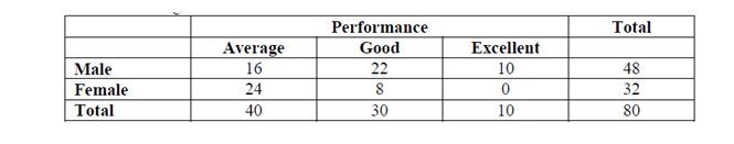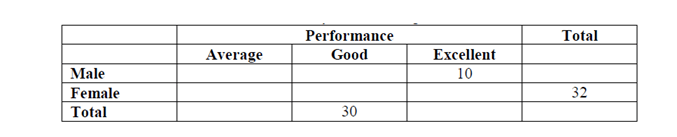 DIRECTION : A professor keeps data on students tabulated by performance and sex of the student. The data is kept on a computer disk, but unfortunately some of it is lost because of a virus. Only the following could be recovered: