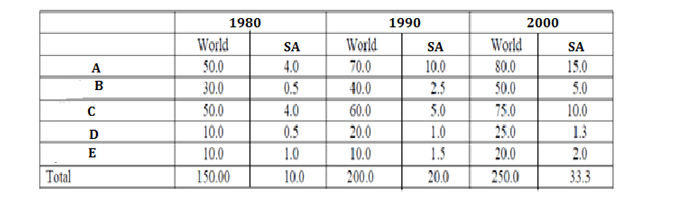 Directions: Given below are the forecasts of the World and SA energy demand for the years 1980, 1990 and 2000 AD and the forecast made for these years follows for the subsequent decade as well. For example, the forecast for 1990 means the forecast for years 1990-1999. The demand is given in million barrels per day, crude oil equivalent.