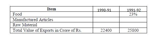 DIRECTION : In 1990 – 91, value of exports of manufactured articles exceeds over the value of exports of raw materials by 100%. In 1991 – 92, the ratio of % of exports of raw material to that of exports of manufactured articles is 3 : 4. Value of Exports of food in 1991 – 92 exceeds the 1990– 91 figures by Rs. 1006 crore.