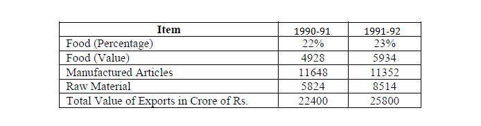 The starting point for filling the data in the vacant columns of the given table should from food’ export value. We know that in 1991-92, value of food export is 23% of 25800= 5934. Now as it is given that this figure is 1006 cr more than last year’s value, hence value of food in 1990-91 is 4928. (The rest of the explanation of how the following values were arrived at is given after the table).