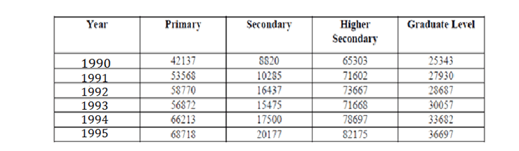There is a constant growth though primary level books, but it has declined in the year 1993. But except for the year 1992 , Secondary and Higher secondary level books have shown a consistent increase. But from all the graduate level books have shown a consistent growth over the period.