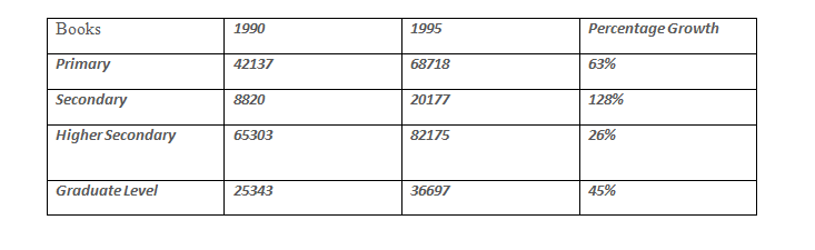 From the table it is shown that percentage growth is least for higher secondary books i.e. 26%.