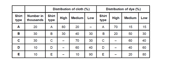 A clothing company produces five types of shirts — A, B, C, D and E — using cloth of three qualities — high, medium and low and using dyes of three qualities — high, medium and low. One shirt requires 1.5 m of cloth. The following table gives respectively: