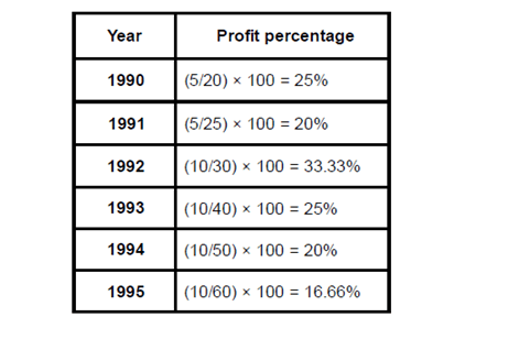 Percentage growth in profit in year 1995 over 1994 = (10/60) x 100 = 16.66%,