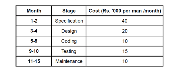 Question 1. Due to overrun in ‘design’, the design stage took 3 months, i.e. months 3, 4 and 5. The number of people working on design in the fifth month was 5. Calculate the percentage change in the cost incurred in the fifth month. (Due to improvement in ‘coding’ technique, this stage was completed in months 6-8 only.)