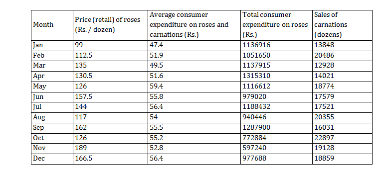 The retail prices of flowers, consumer expenditure on flowers and sales of flowers for the calendar year 2009, in Phoolgaon, a small town with a population of 70000, is summarized in table 2.