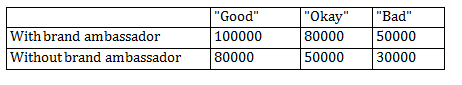 If the company fixes price at Rs. 3.5 lakh, the annual sales of its small cars for different states of the economy and for different kinds of TV ads are summarized in table 3. The figures in the first row are annual sales of the small cars when the company uses a high profile individual as its brand ambassador in its TV ads and the ones in the second row are that when the company does not use any brand ambassador in its TV ads, for different states of the economy.