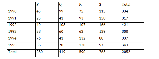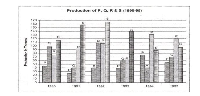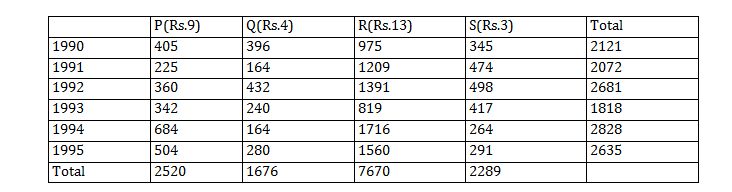 Question 4. Individual revenue of P, Q, R and S for the entire period (1990-1995) is calculated based on the price of Rs.9, Rs.4, Rs.13 and Rs.3 respectively. Which product fetches the lowest revenue?