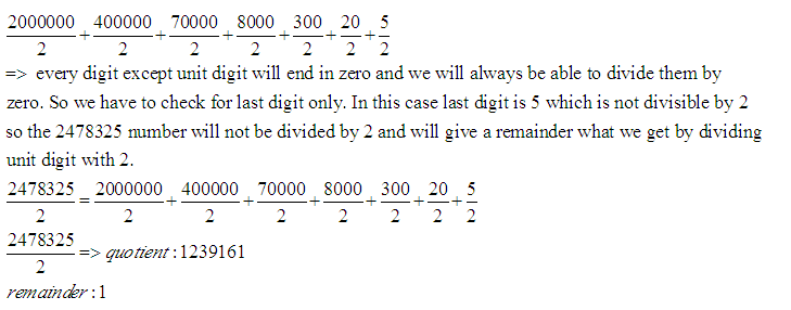 Divisibility check for 2: Check the last digit of the given number. If it is even then the number will be divisible by 2. So if the unit digit is (0,2,4,6,8) the number will surely be divided by 2.
