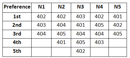Amily Company has its office on the Fourth floor of a multi-storied building in Delhi. There are 5 rooms to be allotted to 5 managers (designated N1 to N5), each of whom will occupy one room. Each room has its own advantages and disadvantages. Some have the sea view, while others are closer to either the lift or the dining room, while some are more spacious. Each of the five managers was asked to rank the room preferences amongst the rooms 401, 402, 403, 404 and 405. Their preferences were recorded as follows: