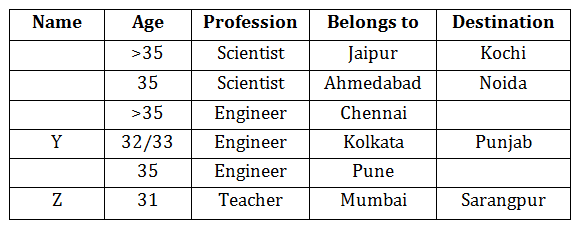 From the fourth statement, we can say that the youngest passenger, who is the Teacher, gets down at Sarangpur. Now again from statement 4, since person from Mumbai was teacher so the person was youngest and who got down at Jaipur, an engineer was from Kolkata. Hence from the remaining two scientists from Ahmedabad and Jaipur one has to be the oldest. From clue 5, it becomes obvious that scientist from Jaipur is the oldest and this person will be the one who got down at Kochi. Now the only other older person will be the scientist from Ahmedabad and that person should get down at Noida (as Teacher is the youngest, hence only choice who is older than Punjab engineer would be scientist from Ahmedabad as the oldest belongs to Kochi hence cannot belong to Noida) Now, the Engineer from Pune, who is 35 years old, is as old as the Scientist from Ahmedabad.