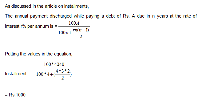 Question 3: Calculate the amount of equal installment, which will discharge a debt of Rs. 4240 due in 4 years at 4% p.a. of simple interest.