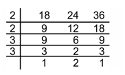 Step 3: We multiply all common prime factors and numbers obtained in last row to get LCM= 2 × 2 × 3 × 3 × 2 = 72.