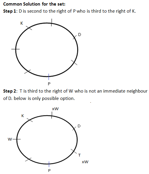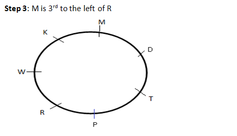 M, D, P, K, R, T and W are around a circle facing the centre. D is second to the right of P who is third to the right of K. T is third to the right of W who is not an immediate neighbour of D. M is third to the left of R.