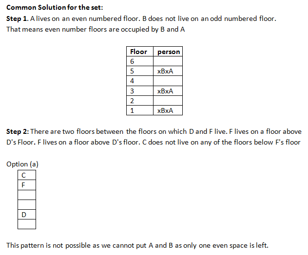 A lives on an even numbered floor. There are two floors between the floors on which D and F live. F lives on a floor above D’s floor. D does not live on floor number 2. B does not live on an odd numbered floor. C does not live on any of the floors below F’s floor. E does not live on a floor immediately above or immediately below the floor on which B lives.