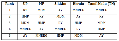 The National Council of Welfare Programmes undertook an effort to study the relative importance the beneficiaries of these programmes. The programmes were Rozgar Yojna (RY), Awas Yojna (AY), Mid-Day Meal Programme(MDM), Health Mission Programme (HMP), Mahatma Gandhi National Rural Employment Guarantee Scheme (MNREG). The level of dissimilarity between two states is the maximum difference in the rank allotted by the two states to any five programmes. The following table indicates the rank order of the five programmes in each state.