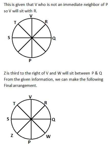 P, Q, R, S, T, V, W and Z are sitting around a circle facing the Centre. T is second to the right of R who is third to the right of P. S is second to the left of P and lies fourth to the right of Q. Z is third to the right of V who is not an immediate neighbor of P.