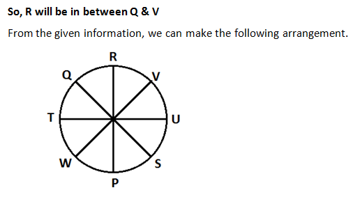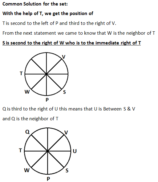 P, Q, R, S, T, U, V and W are sitting around a circle facing the center. T is second to the left of P and third to the right of V. S is second to the right of W who is to the immediate right of T. Q is third to the right of U.