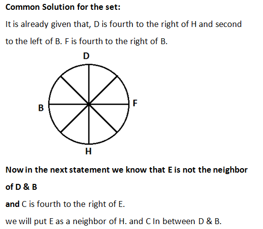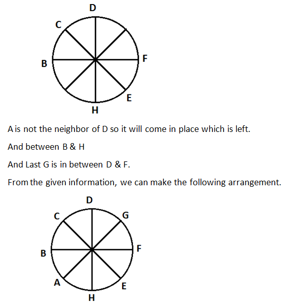 A, B, C, D, E, F, G and H are sitting around a circle facing the center. D is fourth to the right of H and second to the left of B. F is fourth to the right of B. C is fourth to the right of E who is not an immediate neighbor of B or D. A is not an immediate neighbor of D.