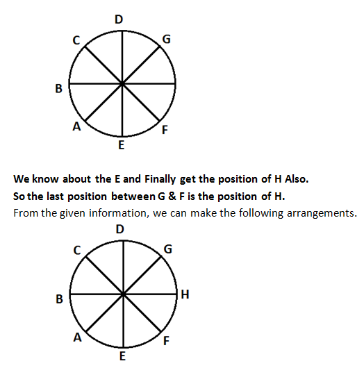 A, B, C, D, E, F, G and H are sitting around a circle facing the center. B is second to the right of D who is third to the right of F. C is second to the left of A who is second to the left of F. G is third to the right of E.