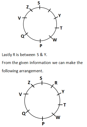 P, Q, R, S, T, V, W, Y and Z are sitting around a circle facing the center. V is second to the left of P who is third to the left of Y. S is fourth to the left of P. T is third to the right of Q who is to the immediate right of V. W is fourth to the right of Z.