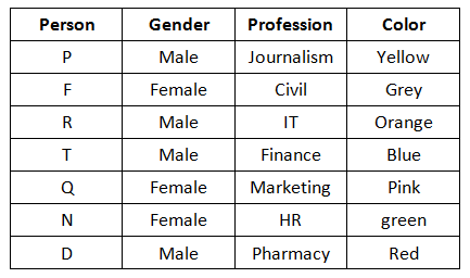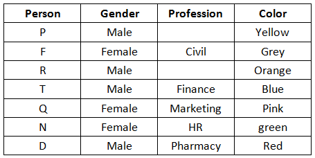 P likes yellow color but does not study IT or HR. The one who studies Civil, likes grey color and is a girl. Q, who is sister of N, studies Marketing and likes pink color. D’s specialization is in pharmacy and likes red color. N, the wife of R studies HR and likes green. F likes grey and R likes orange, the one who likes blue studies finance.