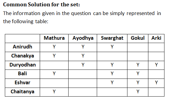 Answer 1: (d) From the above table, it is clear that Duryodhan visited Swarghat, Gokul, Ayodhya and Arki. The correct option is (d).