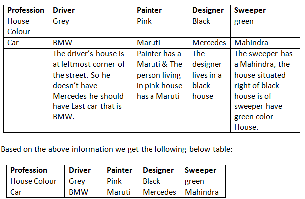 Four people, are from different professions (driver, painter, designer and sweeper), live in the same row of a street and each has a house of a different color (grey, pink, black and green) and a car of a different brand (Maruti, BMW, Mercedes and Mahindra).