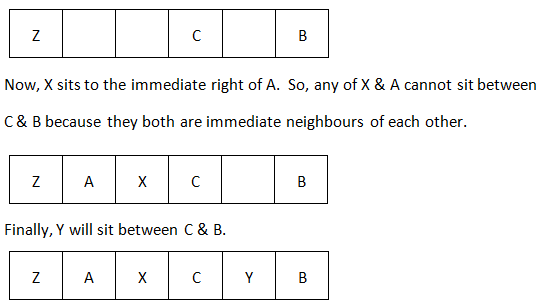 A, B, C, X, Y, Z are seated in a straight line facing North. C is third to the right of Z and B sits second to the right of C. X sits to the immediate right of A.